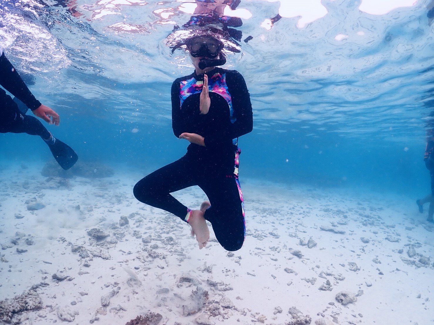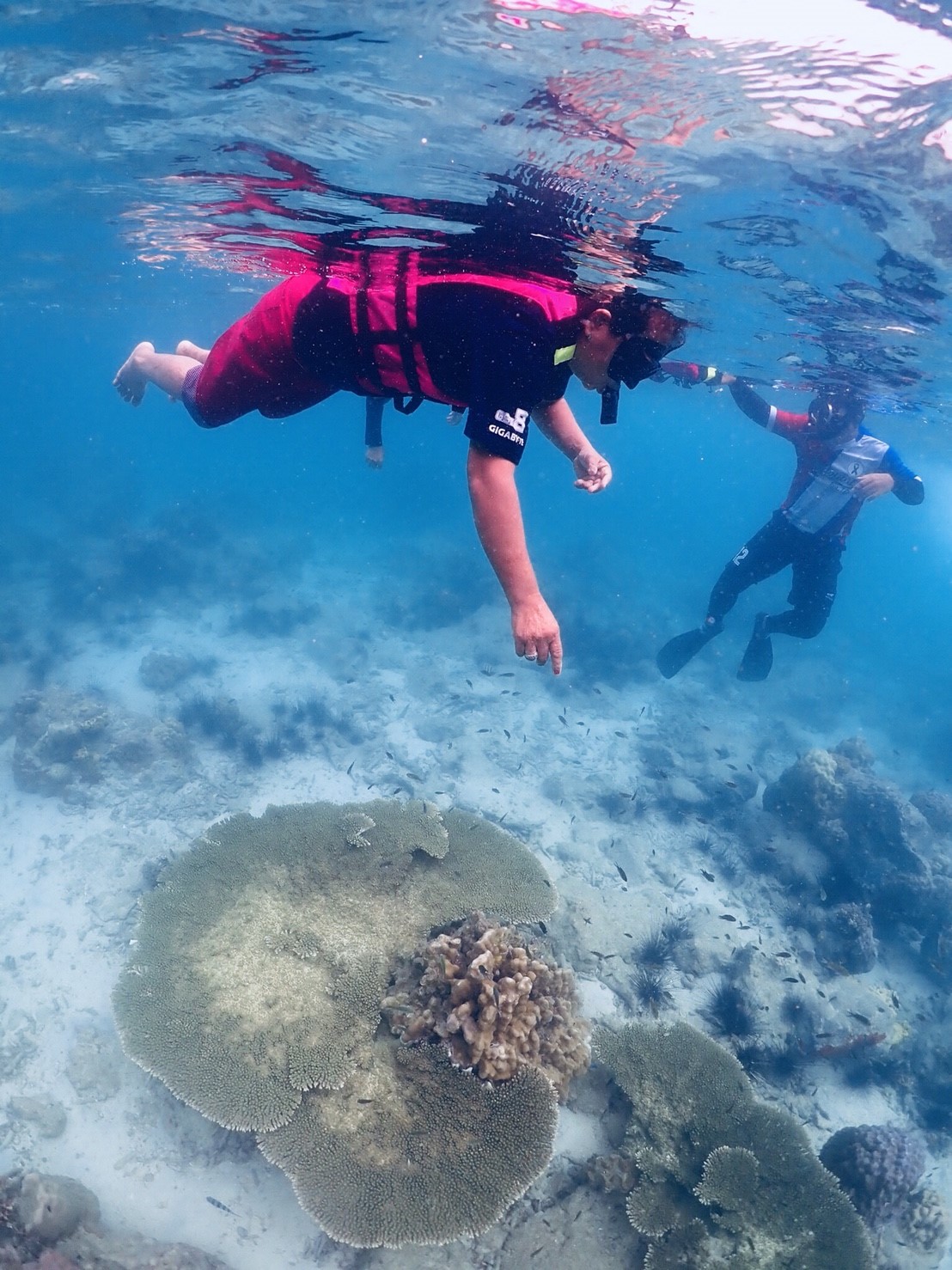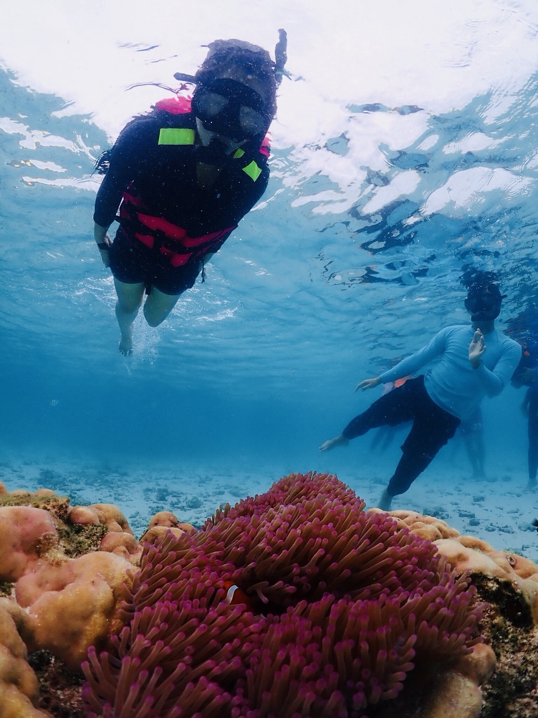 ส่วนคุณป้า กะจะมีพี่ไกด์อีกท่านคอยประกบ ที่สำคัญน้ำไม่ลึก สามารถยืนถึงแต่พี่ไกด์ไม่แนะนำให้ยืนเพราะอาจทำให้เหยียบโดนปะการังเสียหายและกลัวเหยียบไปโดนหอยเม่นค่ะ